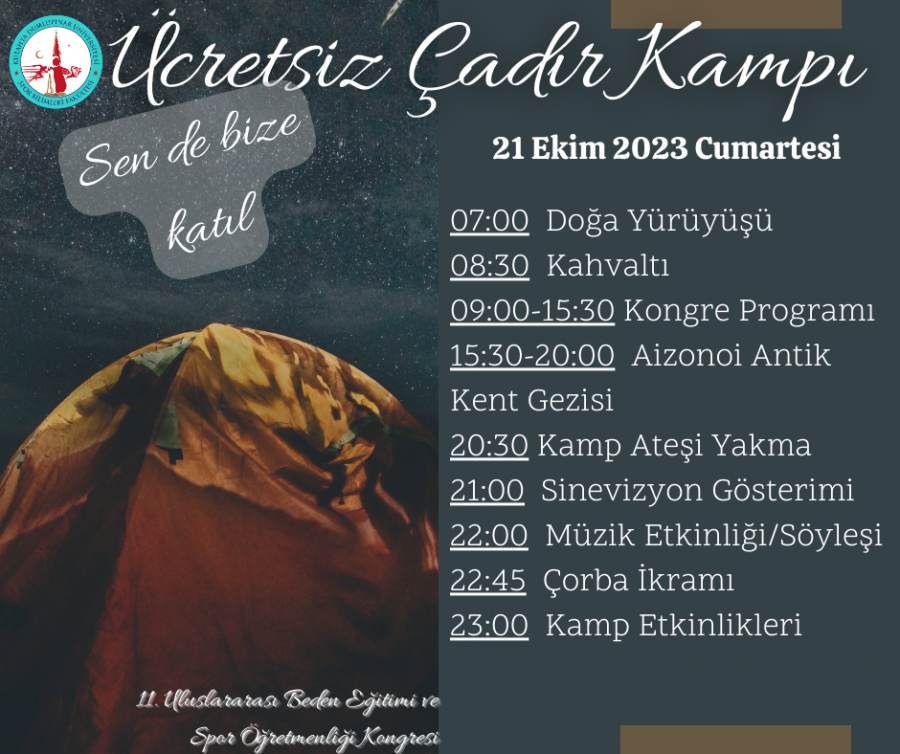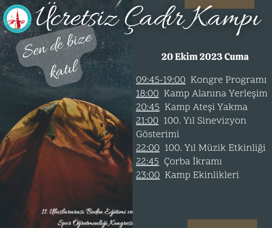 TÜBED ile Kütahya Dumlupınar Üniversitesi Spor Bilimleri Fakültesi iş birliği ile düzenlenecek olan 11. Uluslararası Beden Eğitimi ve Spor Öğretmenliği Kongresi kapsamında, Kütahya Dumlupınar Üniversitesi Spor Bilimleri Fakültesi bahçesinde bir çadır kamp alanı oluşturulacaktır. Kamp alanı Kütahya Gençlik ve Spor İl Müdürlüğünce organize edilecektir. Çadırda konaklamak isteyen katılımcılara ücretsiz olarak